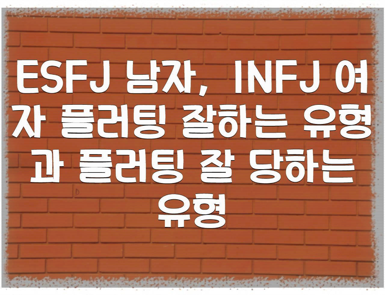 정리드린 내용은 ESFJ 남자, INFJ 여자 플러팅 잘하는 유형과 플러팅 잘 당하는 유형 입니다. 위 내용들이 도움이 되셨길 바랍니다.
